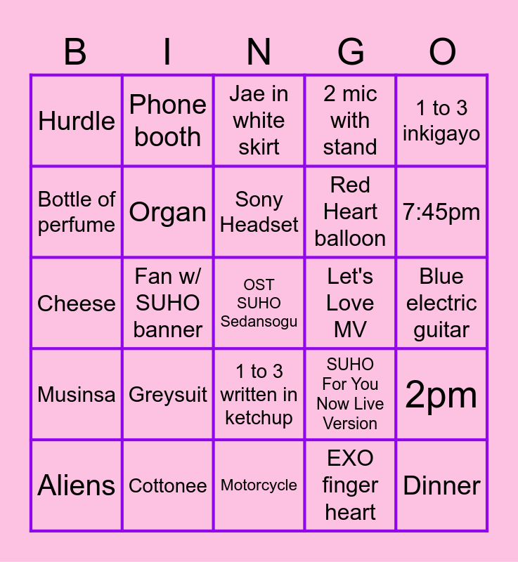 This bingo card has 50 words: Falling shattered glass, OST SUHO Sedansogu, Bread and Pastries, Motorcycle, Greysuit, Black nail polish, Phone booth, Bridge, Bottle of perfume, Do You Have a Moment, Organ, 2 mic with stand, 2pm, SUHO For You Now Live Version, 2 amplifiers, Love You More Gradually| Missing Crown Prince OST, Sony Headset, Let's Love MV, Suho hand heart 🫶, 1 to 3 inkigayo, Fan w/ SUHO banner, EXO finger heart, Hurdle, Red Heart balloon, Little electric guitar, Dinner, 7:45pm, It's live, Jae in white skirt, 1 to 3 written in ketchup, Kwangya cafe, SUHO as an angel, 1 to 3 medley, Zero gravity, Cottonee, Street light / lamp post, Suho with lollipop, Sunset, N Seoul Tower, Blue electric guitar, Suhome pajamas, Olympic Hall venue, 1 to 3, The eclipse of you, Aliens, Cheese, Burger, Monalisa, Musinsa and I.D..