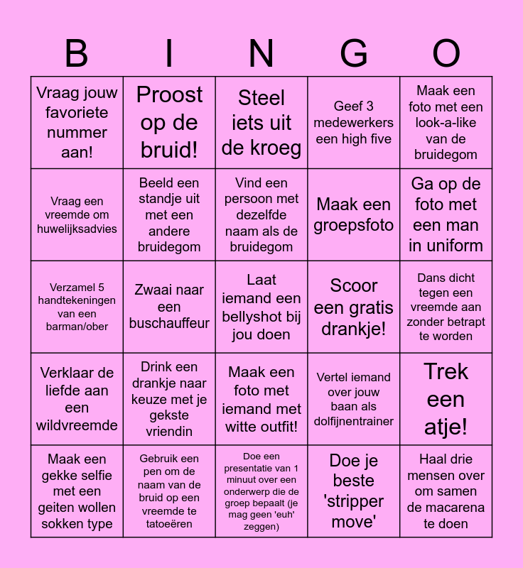This bingo card has a free space and 24 words: Drink een drankje naar keuze met je gekste vriendin, Gebruik een pen om de naam van de bruid op een vreemde te tatoeëren, Vind een persoon met dezelfde naam als de bruidegom, Maak een gekke selfie met een geiten wollen sokken type, Maak een foto met een look-a-like van de bruidegom, Vraag jouw favoriete nummer aan!, Vraag een vreemde om huwelijksadvies, Proost op de bruid!, Scoor een gratis drankje!, Maak een foto met iemand met witte outfit!, Maak een groepsfoto, Verzamel 5 handtekeningen van een barman/ober, Vertel iemand over jouw baan als dolfijnentrainer, Trek een atje!, Beeld een standje uit met een andere bruidegom, Doe je beste 'stripper move', Dans dicht tegen een vreemde aan zonder betrapt te worden, Steel iets uit de kroeg, Ga op de foto met een man in uniform, Zwaai naar een buschauffeur, Haal drie mensen over om samen de macarena te doen, Verklaar de liefde aan een wildvreemde, Geef 3 medewerkers een high five and Doe een presentatie van 1 minuut over een onderwerp die de groep bepaalt (je mag geen 'euh' zeggen).
