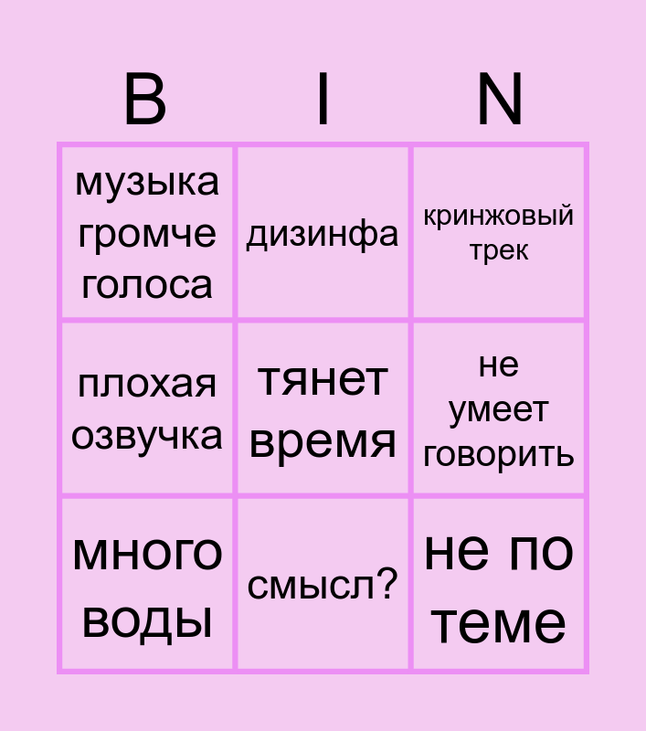 This bingo card has a free space and 8 words: не умеет говорить, кринжовый трек, дизинфа, много воды, музыка громче голоса, не по теме, плохая озвучка and смысл?.