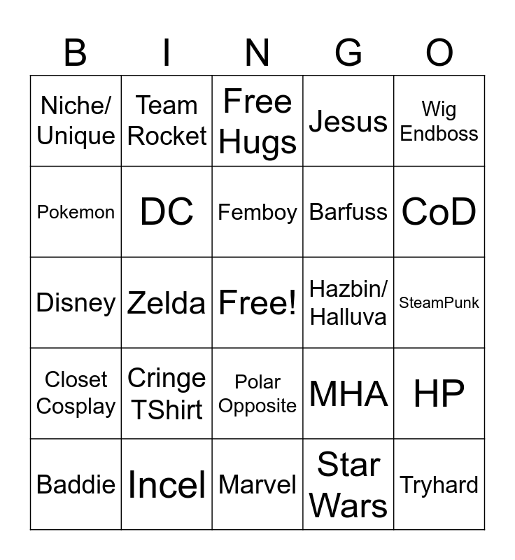 This bingo card has a free space and 24 words: Cringe TShirt, Incel, Femboy, Baddie, Wig Endboss, Niche/ Unique, Pokemon, Team Rocket, Hazbin/ Halluva, Polar Opposite, Barfuss, Disney, MHA, HP, DC, Star Wars, SteamPunk, Free Hugs, CoD, Zelda, Tryhard, Closet Cosplay, Jesus and Marvel.