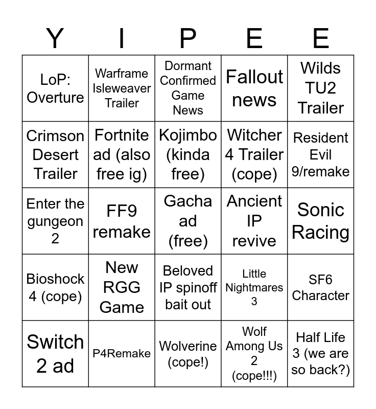 This bingo card has a free space and 24 words: New RGG Game, P4Remake, Kojimbo (kinda free), Switch 2 ad, Wilds TU2 Trailer, LoP: Overture, Crimson Desert Trailer, Warframe Isleweaver Trailer, Ancient IP revive, Beloved IP spinoff bait out, Witcher 4 Trailer (cope), Enter the gungeon 2, Little Nightmares 3, SF6 Character, Fortnite ad (also free ig), Wolf Among Us 2 (cope!!!), Sonic Racing, Dormant Confirmed Game News, Resident Evil 9/remake, FF9 remake, Half Life 3 (we are so back?), Bioshock 4 (cope), Fallout news and Wolverine (cope!).