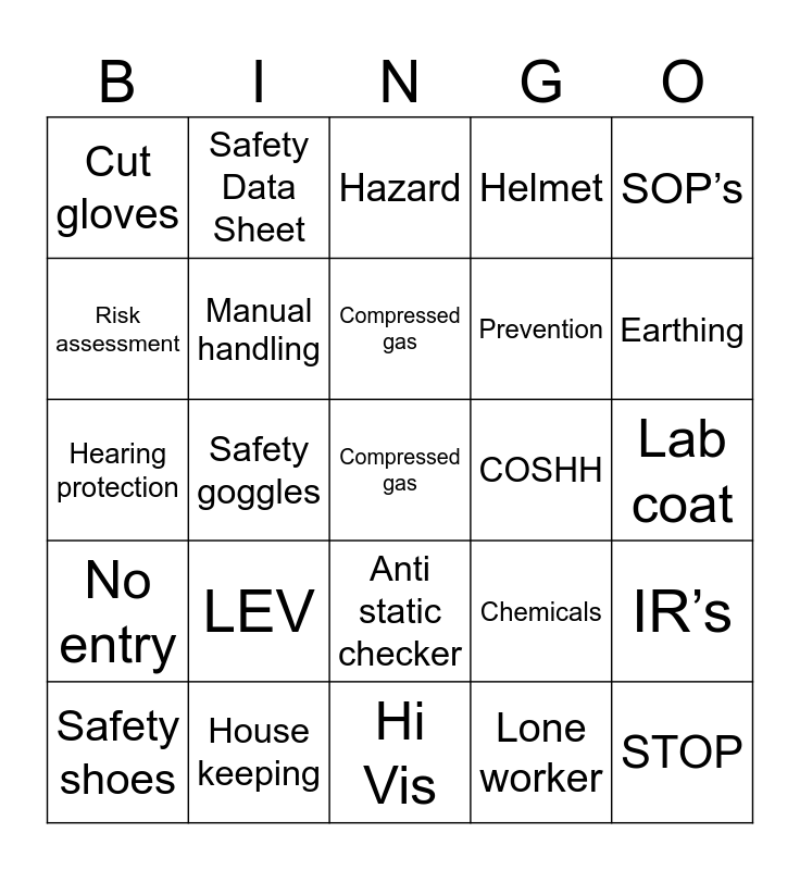 This bingo card has a free space and 29 words: Safety shoes, Caution sign, Safety goggles, First aid kit, Cut gloves, Hazard, Manual handling, LEV, COSHH, House keeping, Lab coat, STOP, Hi Vis, Lone worker, Earthing, Fire drill, Anti static checker, No entry, SOP’s, Hearing protection, Chemicals, Policies, Prevention, Risk assessment, Helmet, Safety Data Sheet, IR’s, Compressed gas and Warning.