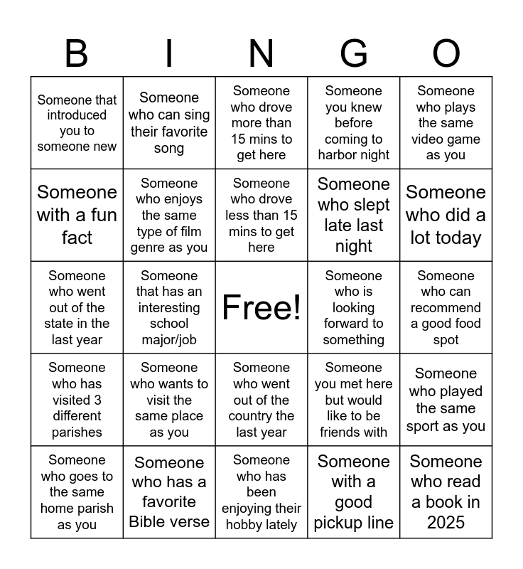 This bingo card has a free space and 24 words: Someone who wants to visit the same place as you, Someone who has a favorite Bible verse, Someone who drove less than 15 mins to get here, Someone who goes to the same home parish as you, Someone who plays the same video game as you, Someone that introduced you to someone new, Someone with a fun fact, Someone who can sing their favorite song, Someone who is looking forward to something, Someone who went out of the country the last year, Someone who slept late last night, Someone who went out of the state in the last year, Someone you met here but would like to be friends with, Someone who played the same sport as you, Someone who enjoys the same type of film genre as you, Someone with a good pickup line, Someone who can recommend a good food spot, Someone who drove more than 15 mins to get here, Someone who did a lot today, Someone that has an interesting school major/job, Someone who read a book in 2025, Someone who has visited 3 different parishes, Someone you knew before coming to harbor night and Someone who has been enjoying their hobby lately.