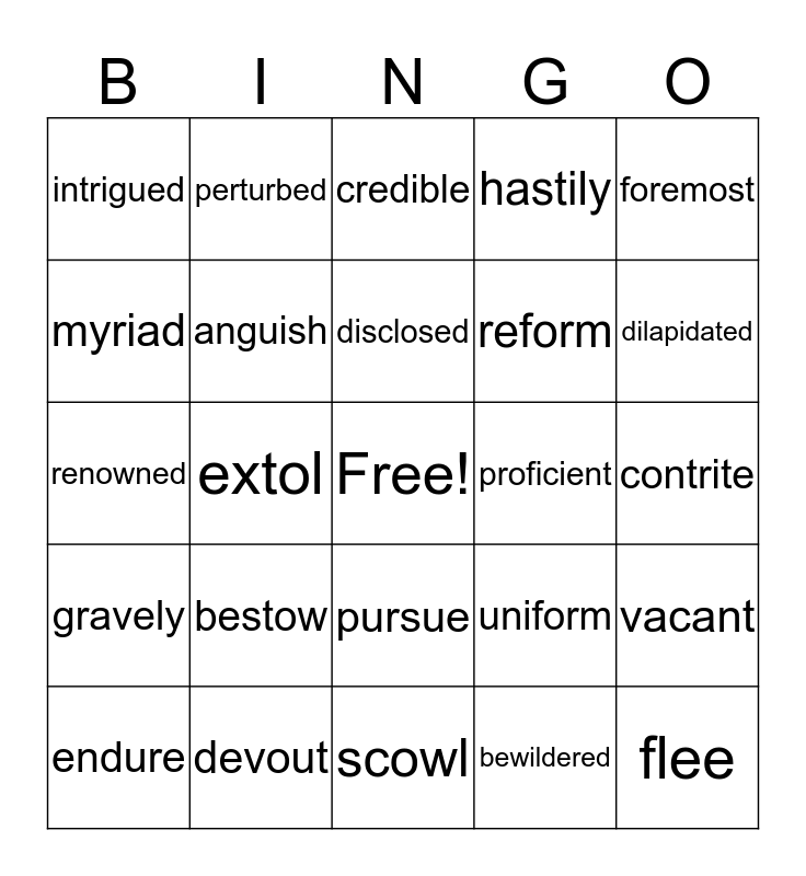 This bingo card has a free space and 24 words: bestow, devout, disclosed, endure, foremost, intrigued, myriad, perturbed, proficient, pursue, reform, renowned, uniform, vacant, anguish, bewildered, contrite, credible, dilapidated, extol, flee, gravely, hastily and scowl.
