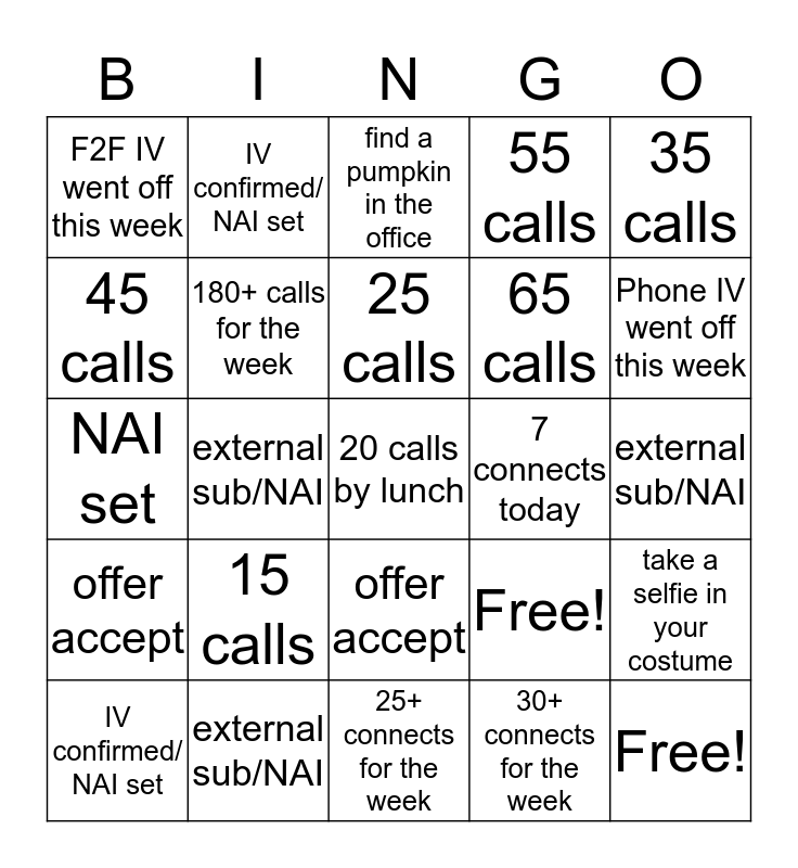 This bingo card has a free space and 24 words: 15 calls, external sub/NAI, 25 calls, IV confirmed/ NAI set, 35 calls, F2F IV went off this week, 45 calls, IV confirmed/ NAI set, 7 connects today, offer accept, 65 calls, NAI set, Free!, take a selfie in your costume, 180+ calls for the week, 30+ connects for the week, external sub/NAI, find a pumpkin in the office, Phone IV went off this week, external sub/NAI, Free!, offer accept, 55 calls and 25+ connects for the week.