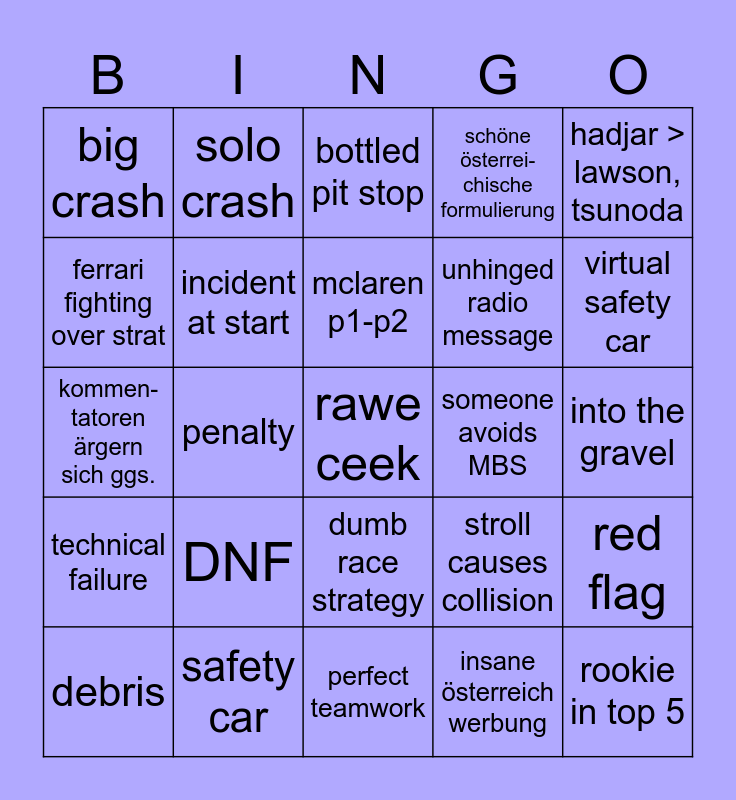 This bingo card has a free space and 27 words: stroll causes collision, alonso 0 points, unhinged radio message, perfect teamwork, ferrari fighting over strat, bottled pit stop, solo crash, technical failure, someone avoids MBS, red flag, kommen- tatoren ärgern sich ggs., schöne österrei- chische formulierung, debris, safety car, virtual safety car, radio complaining about other driver, incident at start, mclaren p1-p2, DNF, big crash, into the gravel, insane österreich werbung, penalty, rookie in top 5, dumb race strategy, hadjar > lawson, tsunoda and office blick.