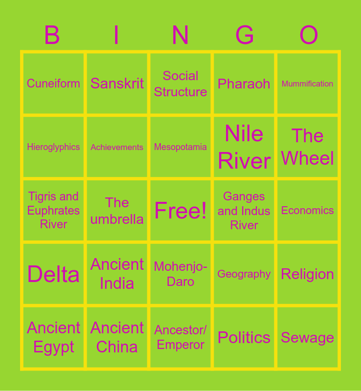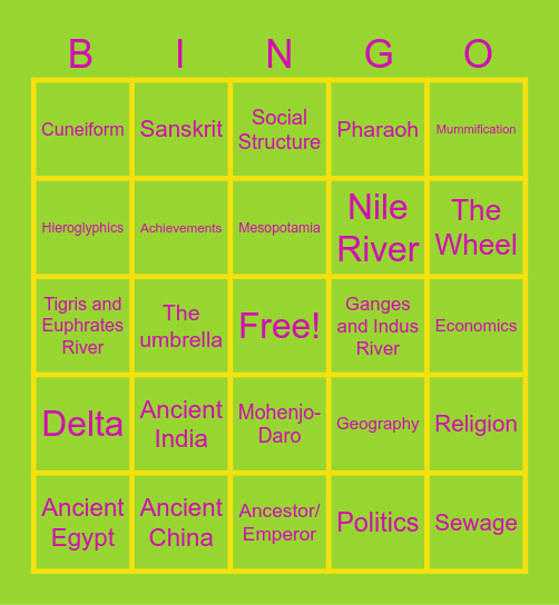 This bingo card has a free space and 24 words: Ancient India, Ancient China, Mesopotamia, Ancient Egypt, Mummification, Cuneiform, Hieroglyphics, Sanskrit, Ganges and Indus River, Mohenjo-Daro, Nile River, Tigris and Euphrates River, Geography, Religion, Achievements, Politics, Economics, Social Structure, The Wheel, The umbrella, Sewage, Delta, Pharaoh and Ancestor/ Emperor.
