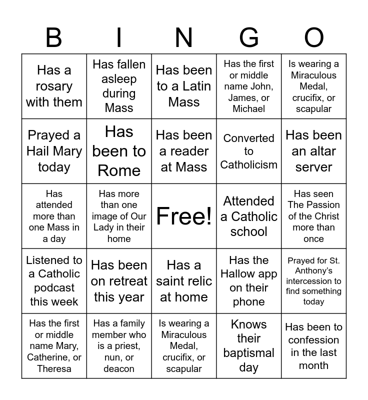 This bingo card has a free space and 24 words: Has been on retreat this year, Has a family member who is a priest, nun, or deacon, Has been a reader at Mass, Has the first or middle name Mary, Catherine, or Theresa, Is wearing a Miraculous Medal, crucifix, or scapular, Has a rosary with them, Prayed a Hail Mary today, Has fallen asleep during Mass, Attended a Catholic school, Has a saint relic at home, Converted to Catholicism, Has attended more than one Mass in a day, Has the Hallow app on their phone, Prayed for St. Anthony’s intercession to find something today, Has been to Rome, Knows their baptismal day, Has seen The Passion of the Christ more than once, Has been to a Latin Mass, Has been an altar server, Has more than one image of Our Lady in their home, Has been to confession in the last month, Listened to a Catholic podcast this week, Has the first or middle name John, James, or Michael and Is wearing a Miraculous Medal, crucifix, or scapular.