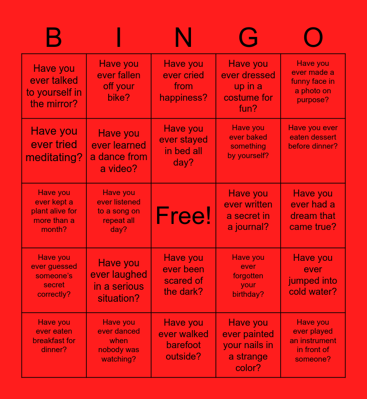 This bingo card has a free space and 24 words: Have you ever laughed in a serious situation?, Have you ever danced when nobody was watching?, Have you ever stayed in bed all day?, Have you ever eaten breakfast for dinner?, Have you ever made a funny face in a photo on purpose?, Have you ever talked to yourself in the mirror?, Have you ever tried meditating?, Have you ever fallen off your bike?, Have you ever written a secret in a journal?, Have you ever been scared of the dark?, Have you ever baked something by yourself?, Have you ever kept a plant alive for more than a month?, Have you ever forgotten your birthday?, Have you ever jumped into cold water?, Have you ever learned a dance from a video?, Have you ever painted your nails in a strange color?, Have you ever had a dream that came true?, Have you ever cried from happiness?, Have you ever eaten dessert before dinner?, Have you ever listened to a song on repeat all day?, Have you ever played an instrument in front of someone?, Have you ever guessed someone’s secret correctly?, Have you ever dressed up in a costume for fun? and Have you ever walked barefoot outside?.