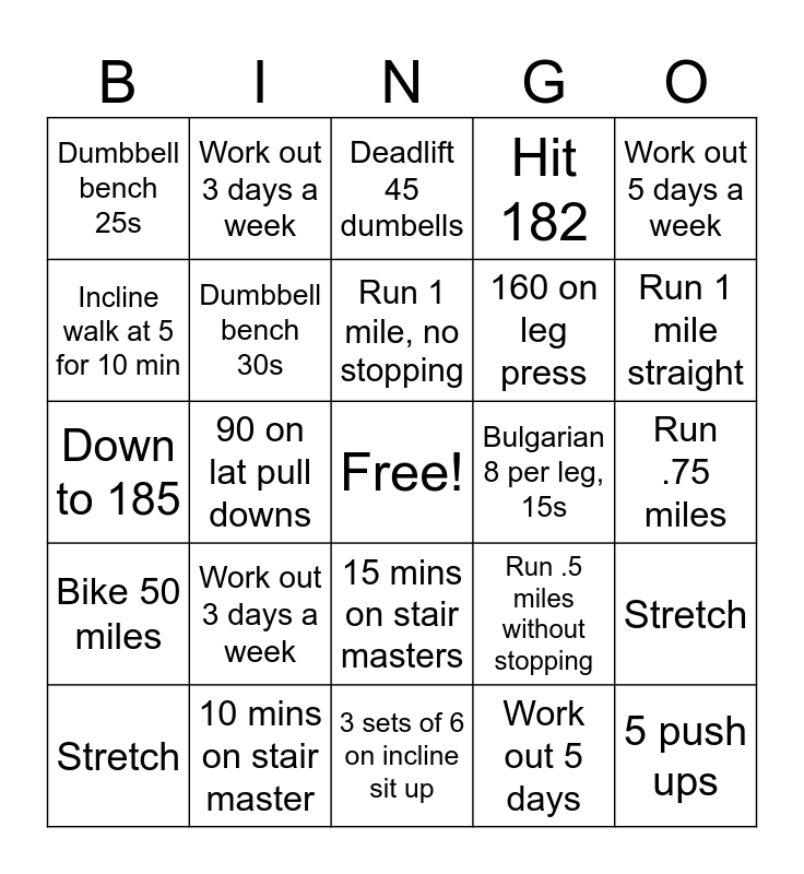 This bingo card has a free space and 24 words: Work out 3 days a week, 10 mins on stair master, Run 1 mile, no stopping, Stretch, Work out 5 days a week, Dumbbell bench 25s, Incline walk at 5 for 10 min, Work out 3 days a week, Bulgarian 8 per leg, 15s, 15 mins on stair masters, 160 on leg press, Down to 185, Run .5 miles without stopping, Stretch, Dumbbell bench 30s, Work out 5 days, Run .75 miles, Deadlift 45 dumbells, Run 1 mile straight, 90 on lat pull downs, 5 push ups, Bike 50 miles, Hit 182 and 3 sets of 6 on incline sit up.