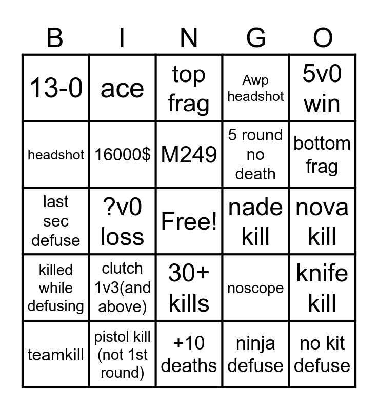 This bingo card has a free space and 24 words: clutch 1v3(and above), pistol kill (not 1st round), M249, teamkill, 5v0 win, 13-0, headshot, ace, nade kill, 30+ kills, 5 round no death, last sec defuse, noscope, knife kill, 16000$, ninja defuse, nova kill, top frag, bottom frag, ?v0 loss, no kit defuse, killed while defusing, Awp headshot and +10 deaths.