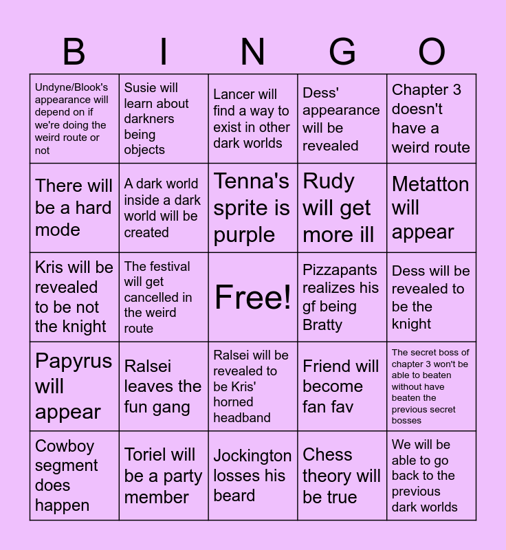 This bingo card has a free space and 24 words: Ralsei leaves the fun gang, Toriel will be a party member, Tenna's sprite is purple, Cowboy segment does happen, Chapter 3 doesn't have a weird route, Undyne/Blook's appearance will depend on if we're doing the weird route or not, There will be a hard mode, Susie will learn about darkners being objects, Pizzapants realizes his gf being Bratty, Ralsei will be revealed to be Kris' horned headband, Rudy will get more ill, Kris will be revealed to be not the knight, Friend will become fan fav, The secret boss of chapter 3 won't be able to beaten without have beaten the previous secret bosses, A dark world inside a dark world will be created, Chess theory will be true, Dess will be revealed to be the knight, Lancer will find a way to exist in other dark worlds, Metatton will appear, The festival will get cancelled in the weird route, We will be able to go back to the previous dark worlds, Papyrus will appear, Dess' appearance will be revealed and Jockington losses his beard.