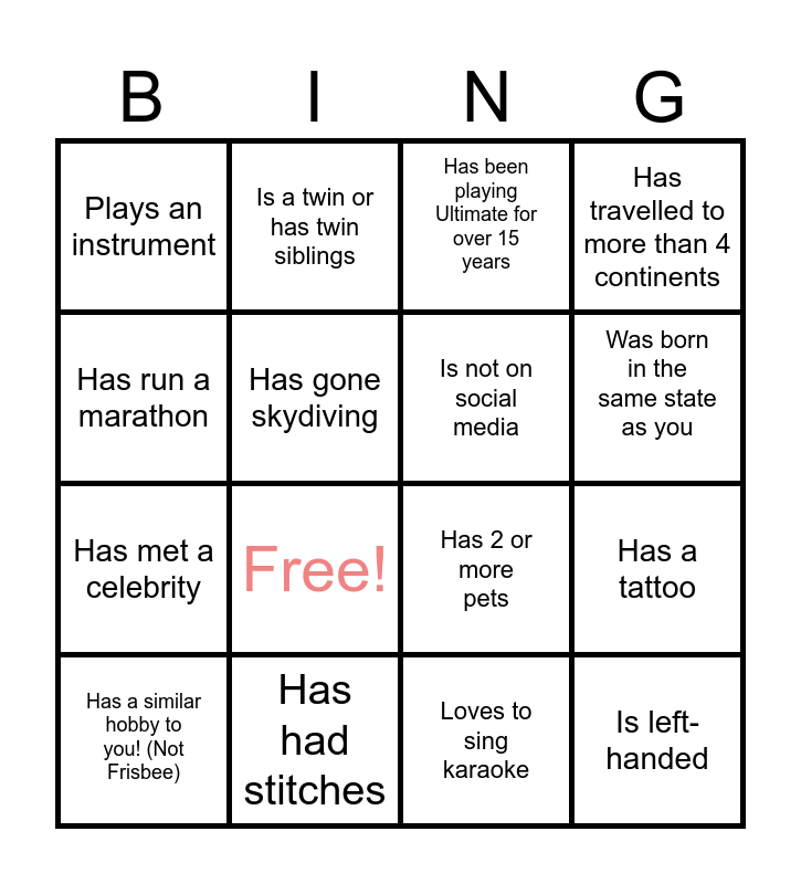 This bingo card has 18 words: Free!, Is left-handed, Has been playing Ultimate for over 15 years, Plays an instrument, Has 2 or more pets, Has travelled to more than 4 continents, Has a similar hobby to you! (Not Frisbee), Is a twin or has twin siblings, Was born in the same state as you, Has met a celebrity, Loves to sing karaoke, Has run a marathon, Has a tattoo, Has gone skydiving, Is not on social media, Hates coffee, Has had stitches and Likes arts & crafts.