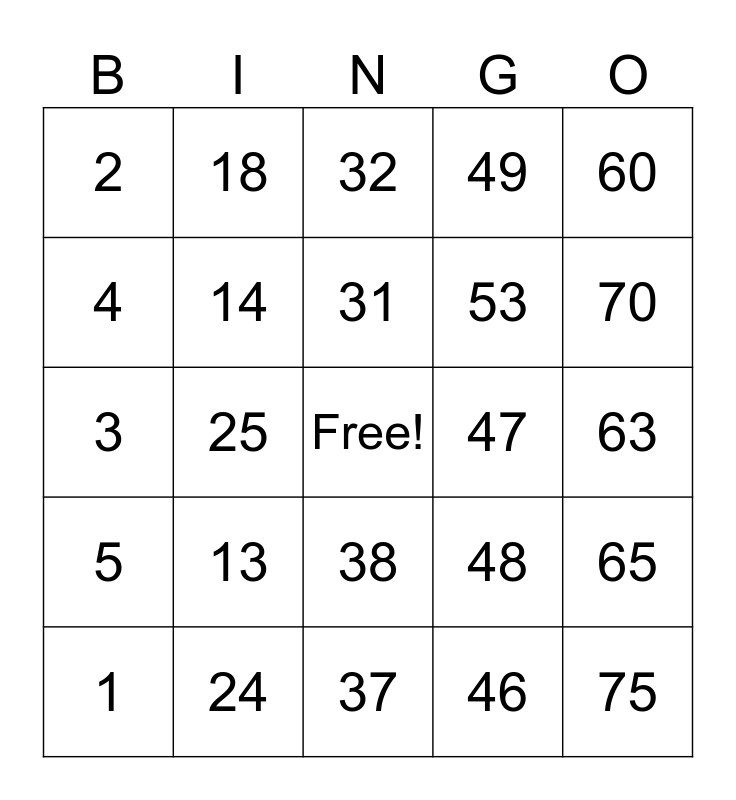 This bingo card has a free space and 24 words: 1, 13, 31, 46, 60, 2, 18, 32, 47, 63, 3, 14, 48, 65, 4, 24, 37, 49, 70, 5, 25, 38, 53 and 75.