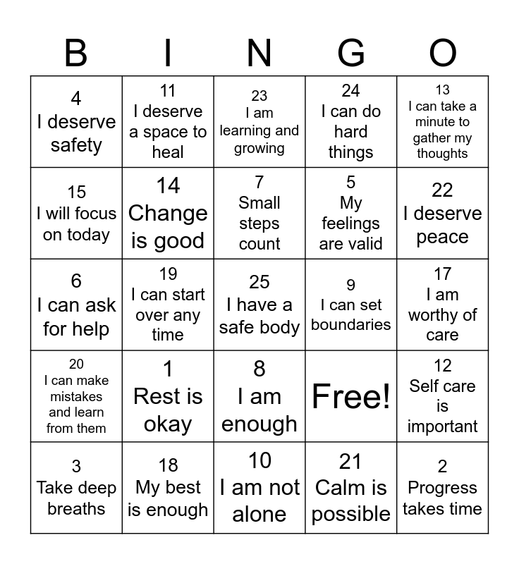 This bingo card has 25 words: 1 Rest is okay, 10 I am not alone, 7 Small steps count, 3 Take deep breaths, 13 I can take a minute to gather my thoughts, 4 I deserve safety, 15 I will focus on today, 11 I deserve a space to heal, 9 I can set boundaries, 8 I am enough, 5 My feelings are valid, 6 I can ask for help, Free!, 12 Self care is important, 14 Change is good, 2 Progress takes time, 17 I am worthy of care, 23 I am learning and growing, 22 I deserve peace, 19 I can start over any time, 25 I have a safe body, 18 My best is enough, 20 I can make mistakes and learn from them, 24 I can do hard things and 21 Calm is possible.