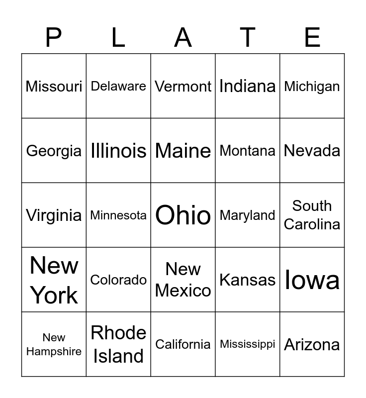 This bingo card has a free space and 47 words: Alabama, Arizona, Arkansas, California, Colorado, Connecticut, Delaware, Florida, Georgia, Idaho, Illinois, Indiana, Iowa, Kansas, Kentucky, Louisiana, Maine, Maryland, Massachusetts, Michigan, Minnesota, Mississippi, Missouri, Montana, Nebraska, Nevada, New Hampshire, New Jersey, New Mexico, New York, North Carolina, North Dakota, Oklahoma, Oregon, Pennsylvania, Rhode Island, South Carolina, South Dakota, Tennessee, Texas, Utah, Vermont, Virginia, Washington, West Virginia, Wisconsin and Wyoming.