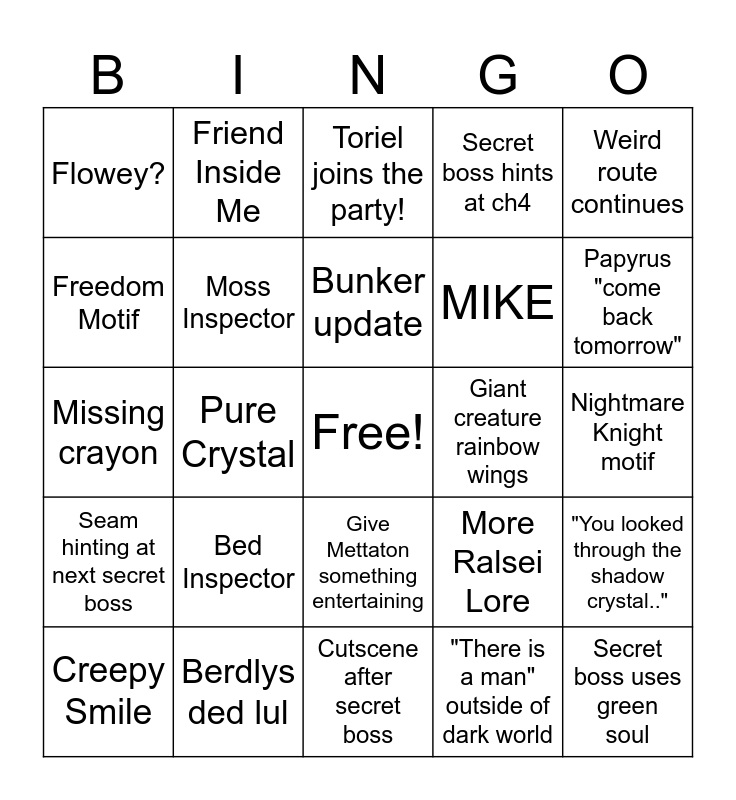 This bingo card has a free space and 24 words: Bed Inspector, Berdlys ded lul, Bunker update, Creepy Smile, Weird route continues, Flowey?, Freedom Motif, Friend Inside Me, Giant creature rainbow wings, Give Mettaton something entertaining, MIKE, Missing crayon, More Ralsei Lore, "You looked through the shadow crystal..", Moss Inspector, "There is a man" outside of dark world, Nightmare Knight motif, Toriel joins the party!, Papyrus "come back tomorrow", Pure Crystal, Secret boss uses green soul, Seam hinting at next secret boss, Secret boss hints at ch4 and Cutscene after secret boss.