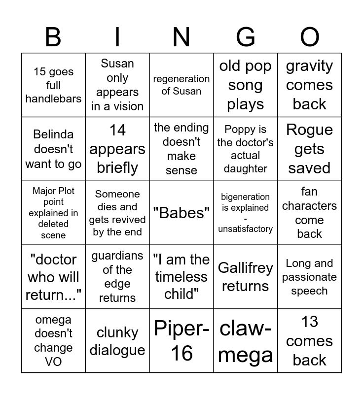 This bingo card has a free space and 24 words: guardians of the edge returns, clunky dialogue, the ending doesn't make sense, omega doesn't change VO, gravity comes back, 15 goes full handlebars, Belinda doesn't want to go, Susan only appears in a vision, bigeneration is explained - unsatisfactory, "I am the timeless child", Poppy is the doctor's actual daughter, Major Plot point explained in deleted scene, Gallifrey returns, Long and passionate speech, 14 appears briefly, claw-mega, fan characters come back, regeneration of Susan, Rogue gets saved, Someone dies and gets revived by the end, 13 comes back, "doctor who will return...", old pop song plays and Piper-16.
