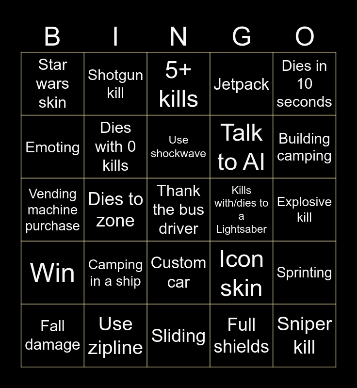 This bingo card has a free space and 24 words: Camping in a ship, Use zipline, Use shockwave, Fall damage, Dies in 10 seconds, Star wars skin, Emoting, Shotgun kill, Kills with/dies to a Lightsaber, Custom car, Talk to AI, Vending machine purchase, Icon skin, Sprinting, Dies with 0 kills, Full shields, Explosive kill, 5+ kills, Building camping, Dies to zone, Sniper kill, Win, Jetpack and Sliding.