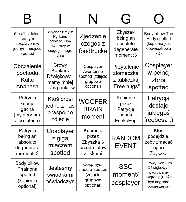 This bingo card has 25 words: Cosplayer z giga mieczem spotted, Cosplayer Jiaoqiu spotted (zdjęcie grupowe optional), Cosplayer Aventurine spotted (zdjęcie grupowe optional), Body pillow Phainona spotted (kupienie optional), Body pillow The Herty spotted (kupienie jest obowiązkowe xD), 5 osób z takim samym cosplayem w jednym miejscu spotted, Obczajenie pochodu Kultu Ananasa, Wychodzimy z Pyrkonu odnieść łupy dwa razy w ciągu jednego dnia, Kupienie przez Patrycję figurki FunkoPop, Kupienie przez Zbyszka 3 przedmiotów z liskami, Przytulenie ziomeczka z tabliczką "Free hugs", Patrycja kupuje gacha (mystery box albo loteria), RANDOM EVENT, Ktoś podejdzie, żeby zmacać ogon Zbyszka, Growy Konkurs Dźwiękowy - mamy mniej niż 5 punktów, Growy Konkurs Dźwiękowy - wygrywamy nagrodę (może być nagroda pocieszenia), Patrycja dostaje jakiegoś freebesa ;), Zjedzenie czegoś z foodtrucka, Cosplayer w pełnej zbroi spotted, Ktoś prosi jedno z nas o wspólne zdjęcie, WOOFER BRAIN moment, Jesteśmy świadkami oświadczyn, Patrycja being an absolute degenerate moment :3, Zbyszek being an absolute degenerate moment :3 and SSC moment/ cosplayer.