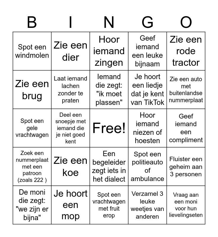 This bingo card has a free space and 24 words: Zie een koe, Je hoort een mop, Iemand die zegt: "ik moet plassen", De moni die zegt: "we zijn er bijna", Zie een rode tractor, Spot een windmolen, Zie een brug, Zie een dier, Hoor iemand niezen of hoesten, Een begeleider zegt iets in het dialect, Je hoort een liedje dat je kent van TikTok, Spot een gele vrachtwagen, Spot een politieauto of ambulance, Fluister een geheim aan 3 personen, Laat iemand lachen zonder te praten, Verzamel 3 leuke weetjes van anderen, Geef iemand een compliment, Hoor iemand zingen, Zie een auto met buitenlandse nummerplaat, Deel een snoepje met iemand die je niet goed kent, Vraag aan een moni voor hun lievelingseten, Zoek een nummerplaat met een patroon (zoals 222 ), Geef iemand een leuke bijnaam and Spot een vrachtwagen met fruit erop.