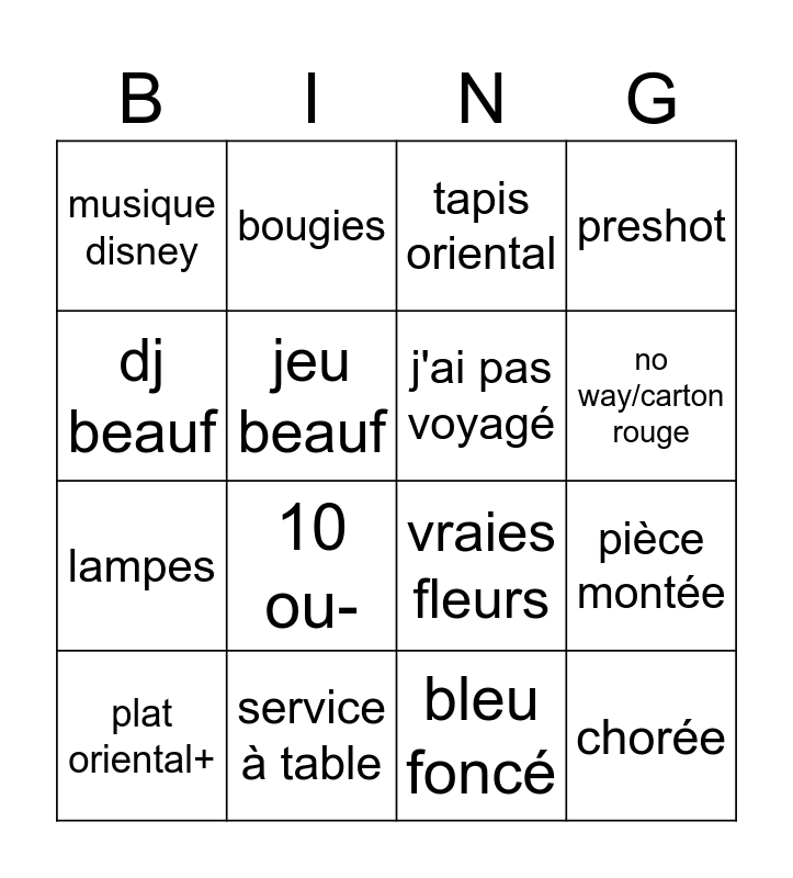 This bingo card has 16 words: service à table, pièce montée, tapis oriental, musique disney, lampes, bougies, vraies fleurs, bleu foncé, dj beauf, jeu beauf, plat oriental+, preshot, 10 ou-, no way/carton rouge, j'ai pas voyagé and chorée.