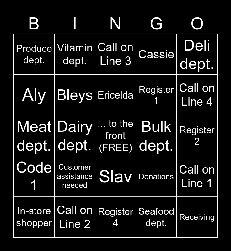 This bingo card has a free space and 35 words: M.O.D., Lance, James, Bleys, Slav, Cassie, Aly, Elizabeth, Ericelda, Austin, Meat dept., Deli dept., Bakery dept., Grocery dept., Produce dept., Bulk dept., Seafood dept., Dairy dept., Code 1, Receiving, Donations, In-store shopper, Call on Line 1, Call on Line 2, Call on Line 3, Call on Line 4, Cashier's assistance, June, Register 1, Register 2, Register 3, Register 4, Customer assistance needed, Vitamin dept. and Manager's office.