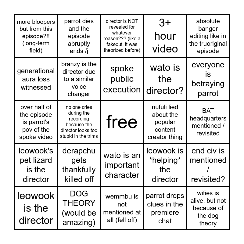 This bingo card has a free space and 24 words: leowook is the director, derapchu gets thankfully killed off, spoke public execution, parrot drops clues in the premiere chat, absolute banger editing like in the truoriginal episode, more bloopers but from this episode?!! (long-term field), parrot dies and the episode abruptly ends /j, director is NOT revealed for whatever reason??? (like a fakeout, it was theorized before), nufuli lied about the popular content creator thing, BAT headquarters mentioned / revisited, over half of the episode is parrot's pov of the spoke video, branzy is the director due to a similar voice changer, leowook is *helping* the director, end civ is mentioned / revisited?, generational aura loss witnessed, DOG THEORY (would be amazing), wemmbu is not mentioned at all (fell off), 3+ hour video, everyone is betraying parrot, leowook's pet lizard is the director, no one cries during the recording because the director looks too stupid in the trims, wato is an important character, wato is the director? and wifies is alive, but not because of the dog theory.
