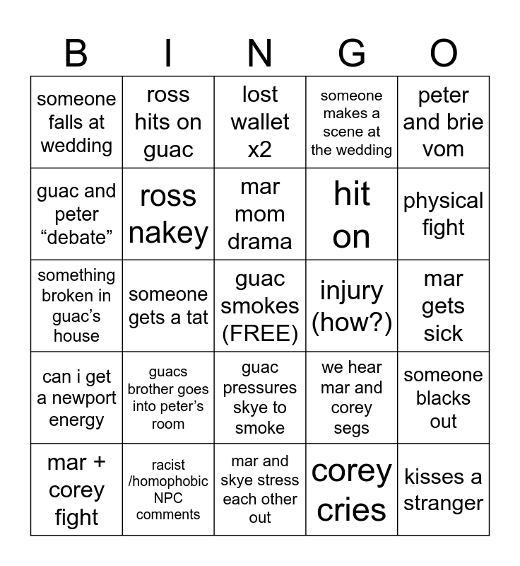 This bingo card has a free space and 24 words: mar + corey fight, guacs brother goes into peter’s room, mar mom drama, corey cries, peter and brie vom, someone falls at wedding, ross hits on guac, lost wallet x2, injury (how?), mar gets sick, something broken in guac’s house, ross nakey, we hear mar and corey segs, someone blacks out, guac and peter “debate”, racist /homophobic NPC comments, mar and skye stress each other out, someone makes a scene at the wedding, physical fight, can i get a newport energy, someone gets a tat, guac pressures skye to smoke, hit on and kisses a stranger.