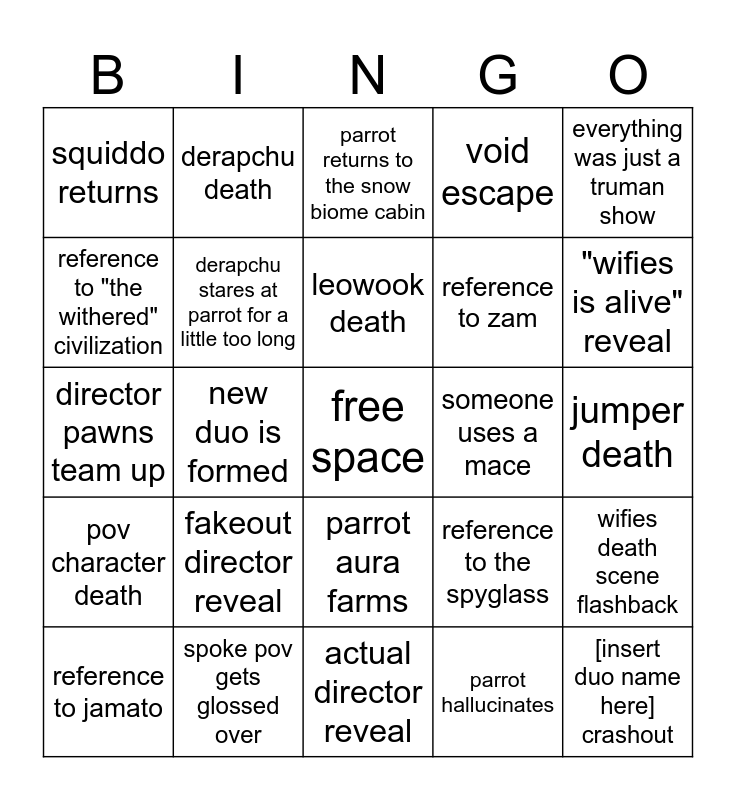 This bingo card has a free space and 24 words: fakeout director reveal, spoke pov gets glossed over, leowook death, reference to jamato, everything was just a truman show, squiddo returns, reference to "the withered" civilization, derapchu death, someone uses a mace, parrot aura farms, reference to zam, director pawns team up, reference to the spyglass, wifies death scene flashback, derapchu stares at parrot for a little too long, parrot hallucinates, jumper death, parrot returns to the snow biome cabin, "wifies is alive" reveal, new duo is formed, [insert duo name here] crashout, pov character death, void escape and actual director reveal.