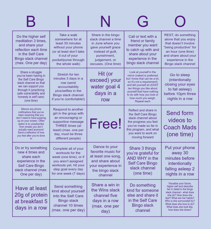 This bingo card has a free space and 24 words: Complete all of your workouts for the week (one time), or if you aren’t assigned workouts yet, hit your step goal every day for one week (7 days), Send something kind about yourself into the Self Care Bingo slack channel 10 times (max. one per day), Hit (or exceed) your water goal 4 days in a row, Have at least 20g of protein at breakfast 5 days in a row, REST, do something alone that you enjoy that doesn’t involve “being productive” for an hour (one time) and share about your experience in the Bingo slack channel, Do the higher self meditation 3 times, and share your reflection each time in the Self Care Bingo slack channel (max. One per day), Share a struggle you’ve been having in the Self Care Bingo slack channel so that we can support you through it (practicing safe vulnerability and honesty is self care) (one time), Take a walk somewhere for at least 30 minutes without your phone (or at least don’t take it out of your pocket/purse through the whole walk), Reflect and share in the Self Care Bingo slack channel about the progress you feel you’ve made so far in this program, and what you want to work on moving forward, Dance to your favorite music for at least one song, and share about your experience in the bingo slack channel, Look at yourself in the mirror (naked is preferred but I know that can be a lot, so it’s not a requirement) and tell yourself at LEAST ten things you like about yourself that have nothing to do with how you look or how much you weigh. Repeat each, Silence any phone notifications that you’ve been receiving that you don’t need to have popping up on your screen. Other option is to unsubscribe from emails you don’t actually need anymore! Send a reflection of how you feel after you’re done in, Share 3 things you’re grateful for AND WHY in the Self Care Bingo slack channel (one time), Put your phone away 30 minutes before intentionally falling asleep 2 nights in a row, Stretch for ten minutes 3 days in a row (send accountability pics/selfies in the Bingo slack channel if you’re comfortable!), Do something kind for someone else and share it in the Self Care Bingo slack channel, Send form videos to Coach Mads (one time), Share in the bingo slack channel a time in June where you gave yourself grace instead of guilt, punishment, judgement, or excuses. (One time), Go to sleep (intentionally closing your eyes to fall asleep) before 10pm three nights in a row, Respond to another girl in the group with an encouraging or supportive message THREE times (at least) (max. one per day, must be three different people), Visualize your future, higher self and describe her in detail in the bingo slack channel - what does she do? How does she feel? What are her habits? Who is she surrounded by? What does she love to do? What does she look like, how does she dress?, Do or try something new 4 times and share each experience in the Self Care Bingo slack channel (max. One per day), Call or text with a friend or family member you want to catch up with and share about your experience in the bingo slack channel and Share a win in the Wins slack channel five days in a row (max. one per day).
