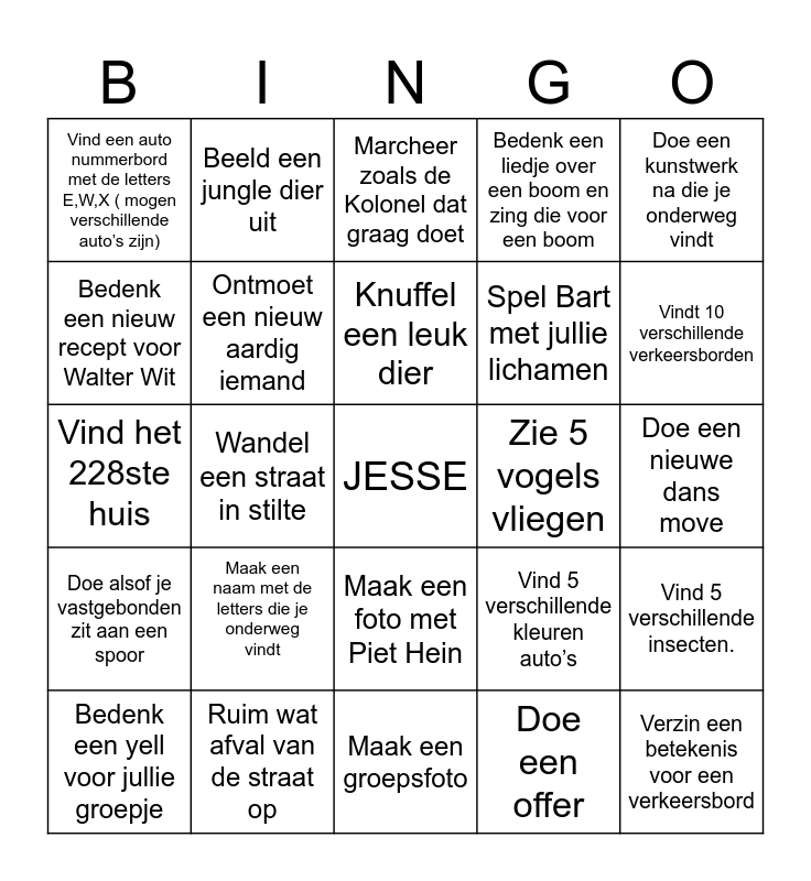 This bingo card has a free space and 24 words: Maak een naam met de letters die je onderweg vindt, Ruim wat afval van de straat op, Knuffel een leuk dier, Bedenk een yell voor jullie groepje, Doe een kunstwerk na die je onderweg vindt, Vind een auto nummerbord met de letters E,W,X ( mogen verschillende auto’s zijn), Bedenk een nieuw recept voor Walter Wit, Beeld een jungle dier uit, Zie 5 vogels vliegen, Maak een foto met Piet Hein, Spel Bart met jullie lichamen, Vind het 228ste huis, Vind 5 verschillende kleuren auto’s, Vind 5 verschillende insecten., Ontmoet een nieuw aardig iemand, Doe een offer, Doe een nieuwe dans move, Marcheer zoals de Kolonel dat graag doet, Vindt 10 verschillende verkeersborden, Wandel een straat in stilte, Verzin een betekenis voor een verkeersbord, Doe alsof je vastgebonden zit aan een spoor, Bedenk een liedje over een boom en zing die voor een boom and Maak een groepsfoto.