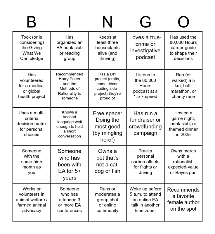 This bingo card has a free space and 24 words: Someone who has been with EA for 5+ years, Someone who has attended 3 or more EA conferences, Has a DIY project (crafts, home décor, coding side-project) they’re proud of, Works or volunteers in animal welfare / farmed animal advocacy, Has used the 80,000 Hours career guide to shape their decisions, Took (or is considering) the Giving What We Can pledge, Has volunteered for a medical or global health project, Has organized an EA book club or reading group, Has run a fundraiser or crowdfunding campaign, Owns a pet that’s not a cat, dog or fish, Listens to the 80,000 Hours podcast at ≥ 1.5 × speed, Uses a multi-criteria decision matrix for personal choices, Tracks personal carbon offsets for flights or driving, Owns merch with a rationalist, expected-value or Bayes pun, Recommended Harry Potter and the Methods of Rationality to someone, Woke up before 5 a.m. to attend an online EA talk in another time zone., Hosted a game night, book club, or themed dinner in 2025, Keeps at least three houseplants alive (and thriving), Ran (or walked) a 5 km, half-marathon, or charity race, Knows a second language well enough to hold a short conversation, Recommends a favorite female author on the spot, Someone with the same birth month as you, Loves a true-crime or investigative podcast and Runs or moderates a group chat or online community.