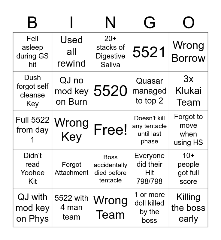 This bingo card has a free space and 24 words: Forgot Attachment, 5522 with 4 man team, 5520, QJ with mod key on Phys, Wrong Borrow, Fell asleep during GS hit, Dush forgot self cleanse Key, Used all rewind, Doesn't kill any tentacle until last phase, Boss accidentally died before tentacle, Quasar managed to top 2, Full 5522 from day 1, Everyone did their Hit 798/798, 10+ people got full score, QJ no mod key on Burn, 1 or more doll killed by the boss, Forgot to move when using HS, 20+ stacks of Digestive Saliva, 3x Klukai Team, Wrong Key, Killing the boss early, Didn't read Yoohee Kit, 5521 and Wrong Team.