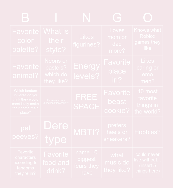This bingo card has a free space and 24 words: Dere type, Favorite food and drink?, Energy levels?, Favorite characters according to fandoms they're in?, Knows what Roblox games they like, Favorite color palette?, Favorite animal?, What is their style?, Favorite beast cookie?, MBTI?, Favorite place irl?, Which fandom universe do you think they would most likely make their home/main place?, prefers heels or sneakers?, Hobbies?, Neons or pastels? which do they like?, what music do they like?, 10 most favorite things in the world?, Likes figurines?, Likes caring or emo men?, Has animal ears (headband/accessory)?, could never live without... (insert 5 things here), pet peeves?, Loves mom or dad more? and name 10 biggest fears they have.