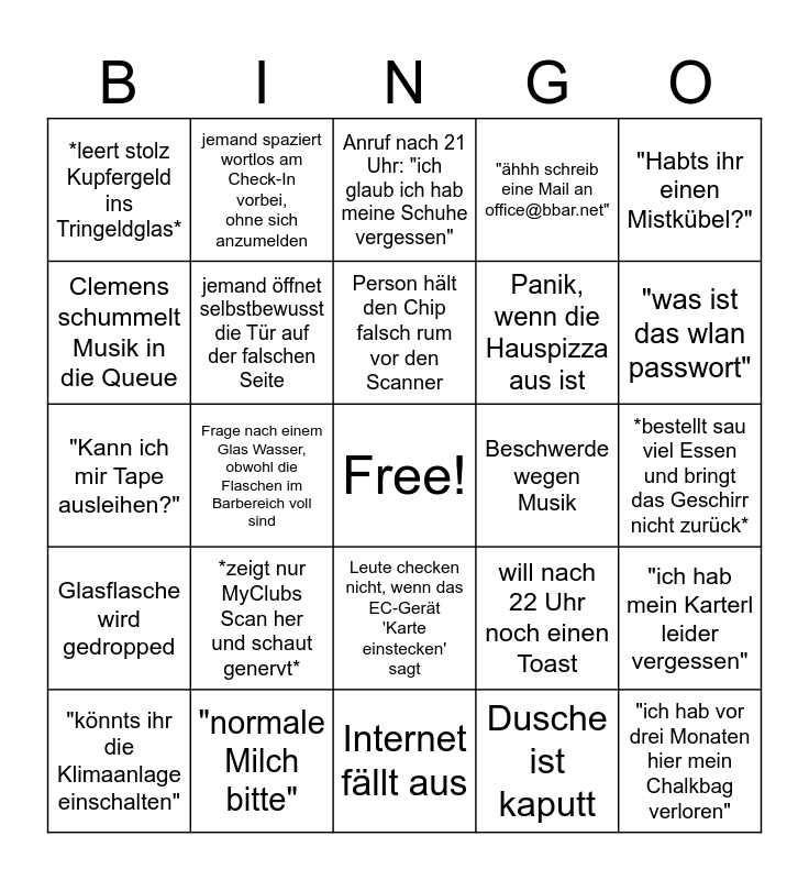 This bingo card has a free space and 27 words: will nach 22 Uhr noch einen Toast, "ein Ottakringer bitte", Panik, wenn die Hauspizza aus ist, Internet fällt aus, Clemens schummelt Musik in die Queue, Anruf nach 21 Uhr: "ich glaub ich hab meine Schuhe vergessen", jemand spaziert wortlos am Check-In vorbei, ohne sich anzumelden, Glasflasche wird gedropped, Beschwerde wegen Musik, "ich hab mein Karterl leider vergessen", "Kann ich mir Tape ausleihen?", "ähhh schreib eine Mail an office@bbar.net", "könnts ihr die Klimaanlage einschalten", "normale Milch bitte", "was ist das wlan passwort", "es gibt die Leihschuhe nimma in meiner Größe", jemand öffnet selbstbewusst die Tür auf der falschen Seite, Person hält den Chip falsch rum vor den Scanner, *zeigt nur MyClubs Scan her und schaut genervt*, *leert stolz Kupfergeld ins Tringeldglas*, *bestellt sau viel Essen und bringt das Geschirr nicht zurück*, Dusche ist kaputt, Frage nach einem Glas Wasser, obwohl die Flaschen im Barbereich voll sind, "ich hab vor drei Monaten hier mein Chalkbag verloren", Leute checken nicht, wenn das EC-Gerät 'Karte einstecken' sagt, "Habts ihr einen Mistkübel?" and Baby im Barbereich beginnt zu schreien.