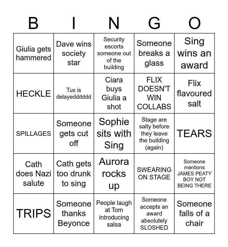 This bingo card has a free space and 24 words: Cath gets too drunk to sing, Someone thanks Beyonce, Ciara buys Giulia a shot, TRIPS, Sing wins an award, Giulia gets hammered, HECKLE, Dave wins society star, Stage are salty before they leave the building (again), Aurora rocks up, FLIX DOESN'T WIN COLLABS, SPILLAGES, SWEARING ON STAGE, Someone mentions JAMES PEATY BOY NOT BEING THERE, Tux is delayedddddd, Someone accepts an award absolutely SLOSHED, TEARS, Security escorts someone out of the building, Flix flavoured salt, Someone gets cut off, Someone falls of a chair, Cath does Nazi salute, Someone breaks a glass and People laugh at Tom introducing salsa.