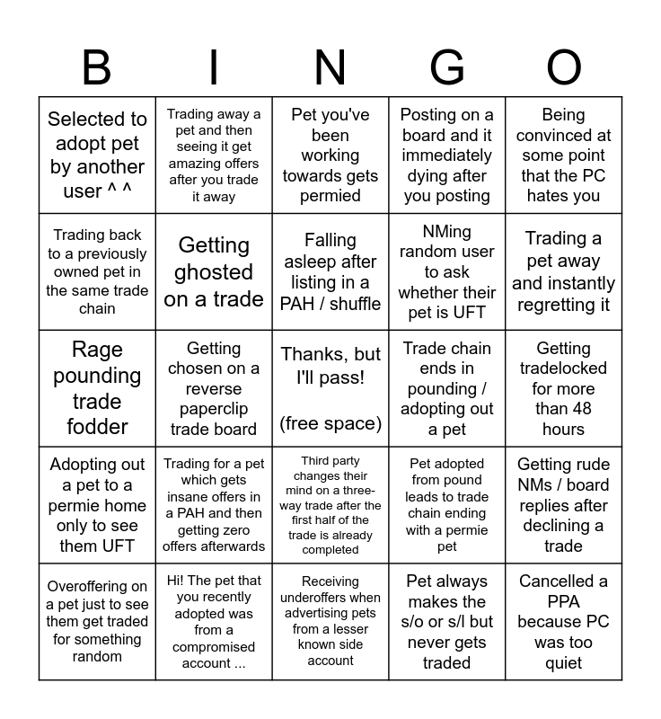 This bingo card has a free space and 24 words: Overoffering on a pet just to see them get traded for something random, Trading for a pet which gets insane offers in a PAH and then getting zero offers afterwards, Falling asleep after listing in a PAH / shuffle, Pet always makes the s/o or s/l but never gets traded, Being convinced at some point that the PC hates you, Selected to adopt pet by another user ^ ^, Trading away a pet and then seeing it get amazing offers after you trade it away, Pet you've been working towards gets permied, Trade chain ends in pounding / adopting out a pet, Getting tradelocked for more than 48 hours, Rage pounding trade fodder, Getting ghosted on a trade, Pet adopted from pound leads to trade chain ending with a permie pet, Getting rude NMs / board replies after declining a trade, Trading back to a previously owned pet in the same trade chain, Hi! The pet that you recently adopted was from a compromised account ..., Receiving underoffers when advertising pets from a lesser known side account, Posting on a board and it immediately dying after you posting, Trading a pet away and instantly regretting it, Adopting out a pet to a permie home only to see them UFT, Getting chosen on a reverse paperclip trade board, Third party changes their mind on a three-way trade after the first half of the trade is already completed, NMing random user to ask whether their pet is UFT and Cancelled a PPA because PC was too quiet.