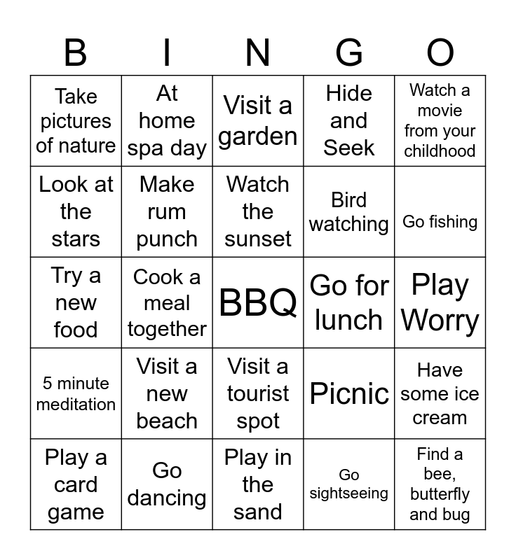 This bingo card has a free space and 24 words: Visit a new beach, Go dancing, Watch the sunset, Play a card game, Watch a movie from your childhood, Take pictures of nature, Look at the stars, At home spa day, Go for lunch, Visit a tourist spot, Bird watching, Try a new food, Picnic, Have some ice cream, Make rum punch, Go sightseeing, Play Worry, Visit a garden, Go fishing, Cook a meal together, Find a bee, butterfly and bug, 5 minute meditation, Hide and Seek and Play in the sand.