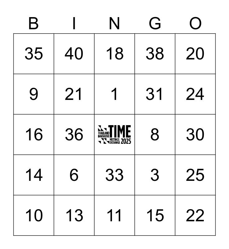 This bingo card has a free space and 24 words: 6, 13, 1, 10, 20, 35, 9, 40, 8, 33, 31, 16, 3, 25, 21, 15, 30, 18, 24, 36, 22, 14, 38 and 11.