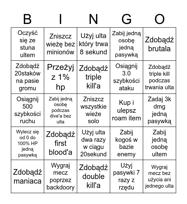 This bingo card has 25 words: Zdobądź first blood'a, Zdobądź double kill'a, Zdobądź triple kill'a, Zdobądź maniaca, Zdobądź brutala, Oczyść się ze stuna ultem, Zdobądź 20staków na pasie gromu, Zniszcz wieżę bez minionów, Kup i ulepsz roam item, Użyj ulta dwa razy w ciągu 20sekund, Osiągnij 3.0 szybkości ataku, Osiągnij 500 szybkości ruchu, Zabij kogoś w bazie enemy, Zabij jedną osobę ultem, Przeżyj z 1% hp, Wygraj mecz bez użycia ani jednego ulta, Zadaj 3k dmg jedną pasywką, Użyj ulta który trwa 8 sekund, Zdobądź triple kill podczas trwania ulta, Zabij jedną osobę podczas dive'a bez ulta, Zniszcz wszystkie wieże solo, Wygraj mecz poprzez backdoory, Wylecz się od 0 do 100% HP jedną pasywką, Zabij jedną osobę jedną pasywką and Użyj pasywki 7 razy z rzędu.