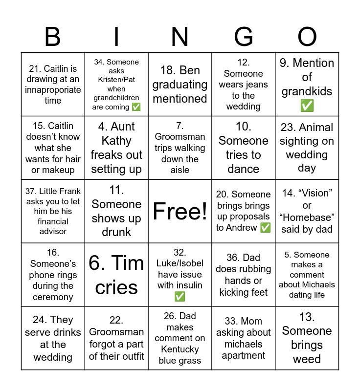 This bingo card has a free space and 38 words: 1. 1 of us wins bingo, 2. Caitlins late ✅, 3. Uncle Joe says something inappropriate, 4. Aunt Kathy freaks out setting up, 5. Someone makes a comment about Michaels dating life, 6. Tim cries, 7. Groomsman trips walking down the aisle, 8. Joey Cries (best man), 9. Mention of grandkids ✅, 10. Someone tries to dance, 11. Someone shows up drunk, 12. Someone wears jeans to the wedding, 13. Someone brings weed, 14. “Vision” or “Homebase” said by dad, 15. Caitlin doesn’t know what she wants for hair or makeup, 16. Someone’s phone rings during the ceremony, 17. The dress is PINK, 18. Ben graduating mentioned, 19. Tim getting electrocuted ✅, 20. Someone brings brings up proposals to Andrew ✅, 21. Caitlin is drawing at an innaproporiate time, 22. Groomsman forgot a part of their outfit, 23. Animal sighting on wedding day, 24. They serve drinks at the wedding, 25. Dad makes comments on “New York Italians” ✅, 26. Dad makes comment on Kentucky blue grass, 27. Dad makes a comment about KFC, 28. Dad makes a comment about horses having long faces, 29. Uncle joes makes a comment about bridesmaids, 30. Uncle Joe brings a gun to the wedding, 31. Uncle Joe makes a comment about his stock trades, 32. Luke/Isobel have issue with insulin ✅, 33. Mom asking about michaels apartment, 34. Someone asks Kristen/Pat when grandchildren are coming ✅, 35. Dad makes comment about all his kids finishing college, 36. Dad does rubbing hands or kicking feet, 37. Little Frank asks you to let him be his financial advisor and 38. Uncle frank complains about being a teacher.