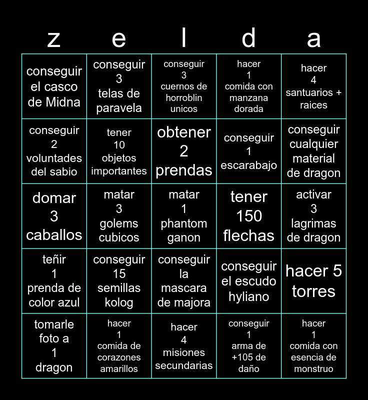 This bingo card has a free space and 24 words: conseguir 15 semillas kolog, hacer 1 comida de corazones amarillos, obtener 2 prendas, tomarle foto a 1 dragon, hacer 4 santuarios + raices, conseguir el casco de Midna, conseguir 2 voluntades del sabio, conseguir 3 telas de paravela, tener 150 flechas, conseguir la mascara de majora, conseguir 1 escarabajo, domar 3 caballos, conseguir el escudo hyliano, hacer 5 torres, tener 10 objetos importantes, conseguir 1 arma de +105 de daño, activar 3 lagrimas de dragon, conseguir 3 cuernos de horroblin unicos, conseguir cualquier material de dragon, matar 3 golems cubicos, hacer 1 comida con esencia de monstruo, teñir 1 prenda de color azul, hacer 1 comida con manzana dorada and hacer 4 misiones secundarias.