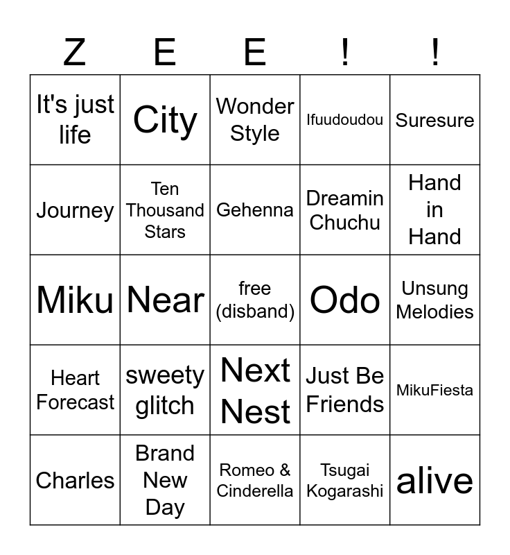 This bingo card has a free space and 24 words: sweety glitch, Brand New Day, Gehenna, Charles, Suresure, It's just life, Journey, City, Odo, Next Nest, Dreamin Chuchu, Miku, Just Be Friends, MikuFiesta, Ten Thousand Stars, Tsugai Kogarashi, Unsung Melodies, Wonder Style, Hand in Hand, Near, alive, Heart Forecast, Ifuudoudou and Romeo & Cinderella.