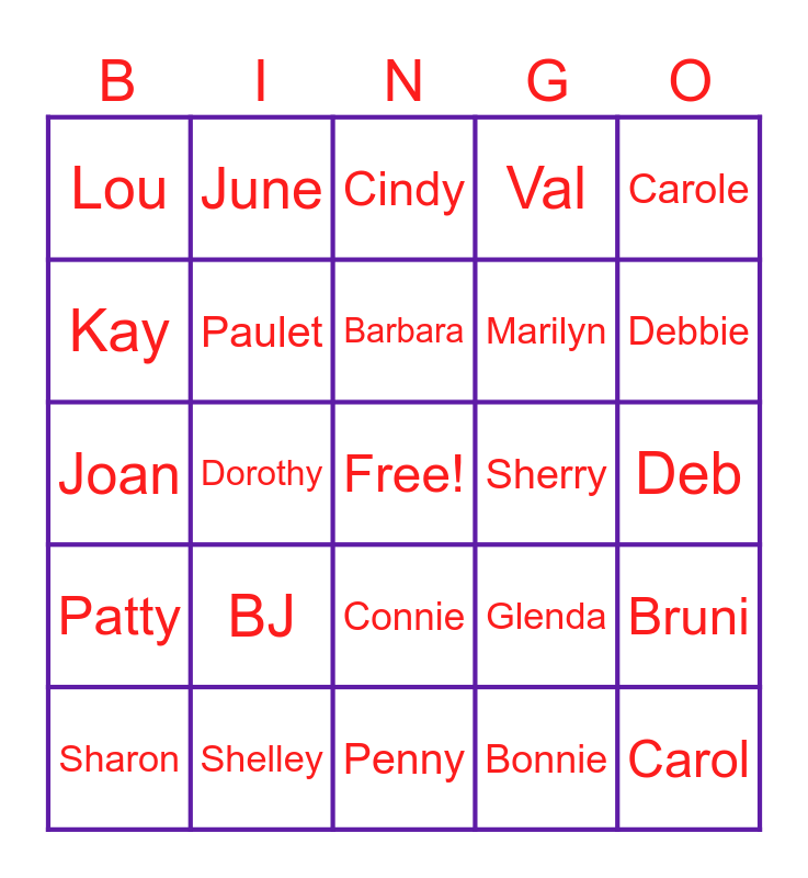 This bingo card has a free space and 42 words: Ann Marie, Barbara, Becky, BJ, Bonnie, Bruni, Carol, Cheryl, Cindy, Connie, Deb, Debbie, Dorothy, Carole, Elizabeth, Glenda, Jennifer, Joan, Judy, June, Kay, Kitty, Linda, Lou, Louise, Lyla, Marilyn, Mary, Myrna, Opal, Pam, Patty, Paulet, Penny, Ruth, Sharon, Shelley, Sherry, Shirley, Sue, Val and Vickie.