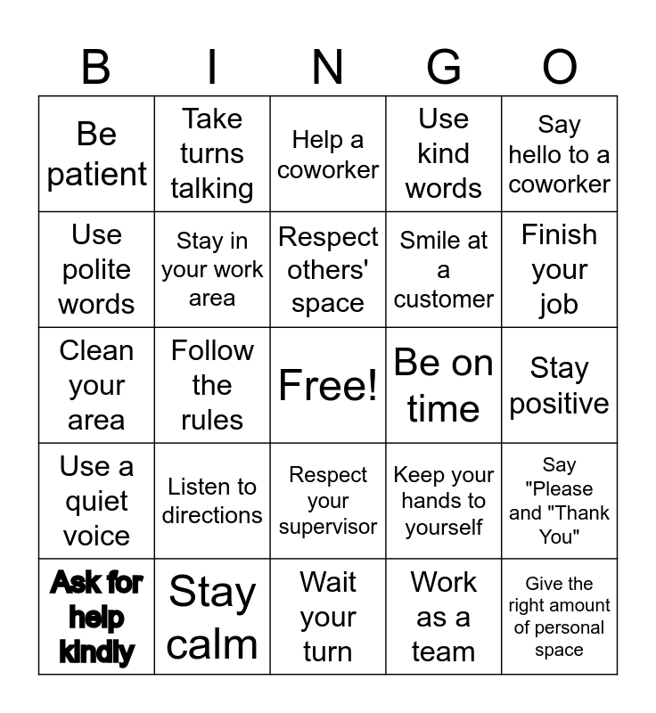 This bingo card has a free space and 24 words: Ask for help kindly, Listen to directions, Respect others' space, Work as a team, Say hello to a coworker, Be patient, Take turns talking, Help a coworker, Be on time, Stay positive, Clean your area, Stay in your work area, Keep your hands to yourself, Say "Please and "Thank You", Use polite words, Stay calm, Wait your turn, Use kind words, Finish your job, Use a quiet voice, Follow the rules, Respect your supervisor, Smile at a customer and Give the right amount of personal space.