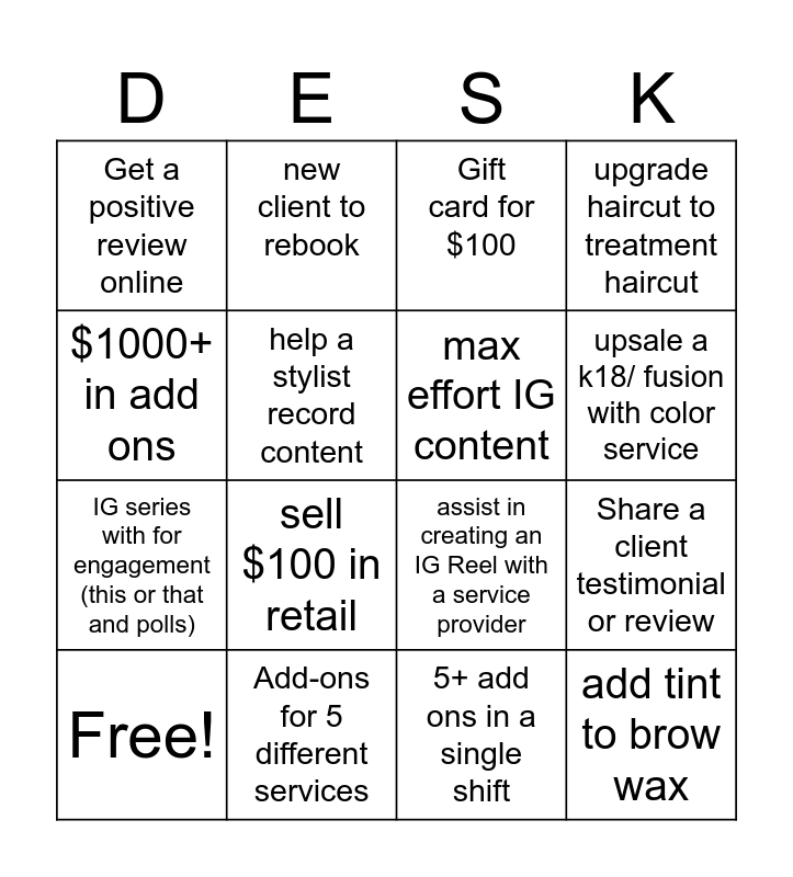 This bingo card has 16 words: Free!, Add-ons for 5 different services, Gift card for $100, upgrade haircut to treatment haircut, $1000+ in add ons, new client to rebook, assist in creating an IG Reel with a service provider, Share a client testimonial or review, Get a positive review online, help a stylist record content, 5+ add ons in a single shift, upsale a k18/ fusion with color service, IG series with for engagement (this or that and polls), sell $100 in retail, max effort IG content and add tint to brow wax.