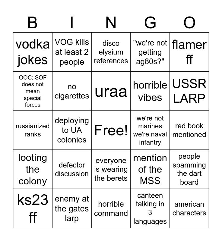 This bingo card has a free space and 24 words: defector discussion, enemy at the gates larp, uraa, ks23 ff, flamer ff, vodka jokes, OOC: SOF does not mean special forces, VOG kills at least 2 people, we're not marines we're naval infantry, everyone is wearing the berets, horrible vibes, russianized ranks, mention of the MSS, people spamming the dart board, no cigarettes, canteen talking in 3 languages, red book mentioned, disco elysium references, USSR LARP, deploying to UA colonies, american characters, looting the colony, "we're not getting ag80s?" and horrible command.