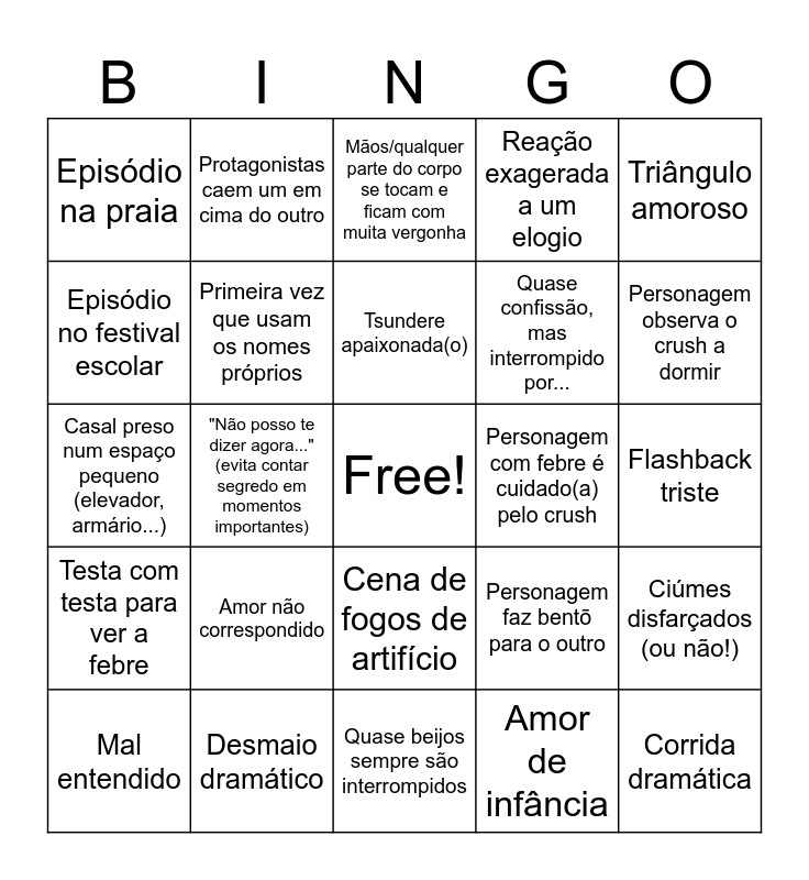 This bingo card has a free space and 24 words: Amor não correspondido, Desmaio dramático, Tsundere apaixonada(o), Mal entendido, Triângulo amoroso, Episódio na praia, Episódio no festival escolar, Protagonistas caem um em cima do outro, Personagem com febre é cuidado(a) pelo crush, Cena de fogos de artifício, Quase confissão, mas interrompido por..., Casal preso num espaço pequeno (elevador, armário...), Personagem faz bentō para o outro, Ciúmes disfarçados (ou não!), Primeira vez que usam os nomes próprios, Amor de infância, Flashback triste, Mãos/qualquer parte do corpo se tocam e ficam com muita vergonha, Personagem observa o crush a dormir, "Não posso te dizer agora..." (evita contar segredo em momentos importantes), Corrida dramática, Testa com testa para ver a febre, Reação exagerada a um elogio and Quase beijos sempre são interrompidos.