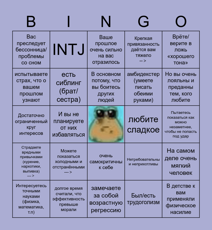 This bingo card has a free space and 24 words: Интересуетесь точными науками (физика, математика, т.п), Можете показаться холодными и отстранёнными --->, В основном потому, что вы боитесь других людей, Был/есть трудоголизм, Врёте/ верите в ложь «хорошего тона», Вас преследует бессонница/проблемы со сном, INTJ, Ваше прошлое очень сильно на вас отразилось, любите сладкое, Пытаетесь показаться как можно незаметнее, чтобы не попасть под удар, Достаточно ограниченный круг интересов, есть сиблинг (брат/сестра), Нетребовательны и неприхотливы, На самом деле очень мягкий человек, испытываете страх, что о вашем прошлом узнают, долгое время считали, что эффективность превыше морали, замечаете за собой возрастную регрессию, Крепкая привязанность даётся вам тяжело -->, Но вы очень лояльны и преданны тем, кого любите, Страдаете вредными привычками (курение, наркотики, выпивка) --->, И вы не планируете от них избавляться, очень самокритичны к себе, амбидекстер (умеете писать обеими руками) and В детстве к вам применяли физическое насилие.